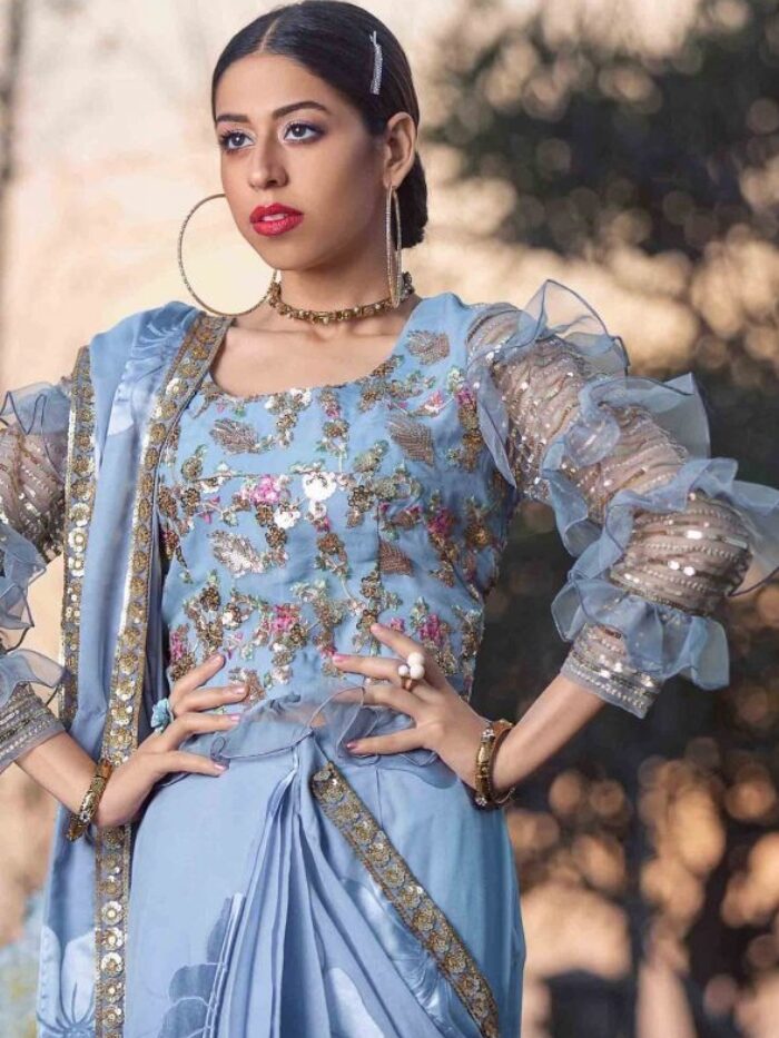 - Embellishments: Intricate mukaish work with crayon blue accents.