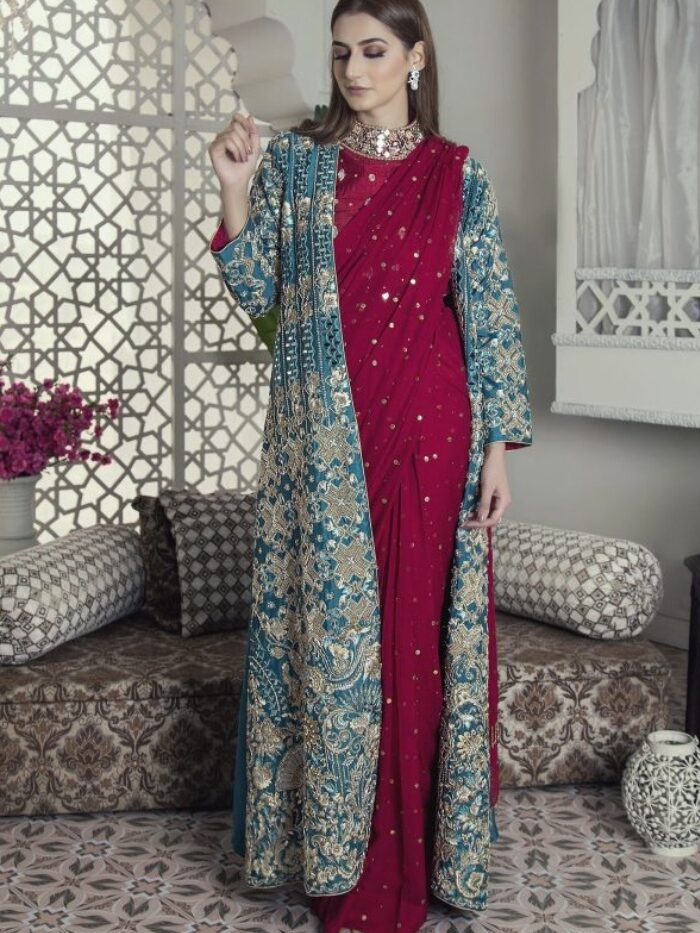 - Embellishments: Intricate mukaish work with crayon blue accents.