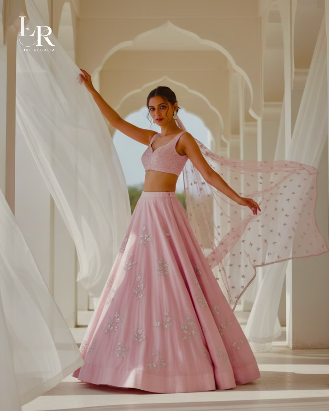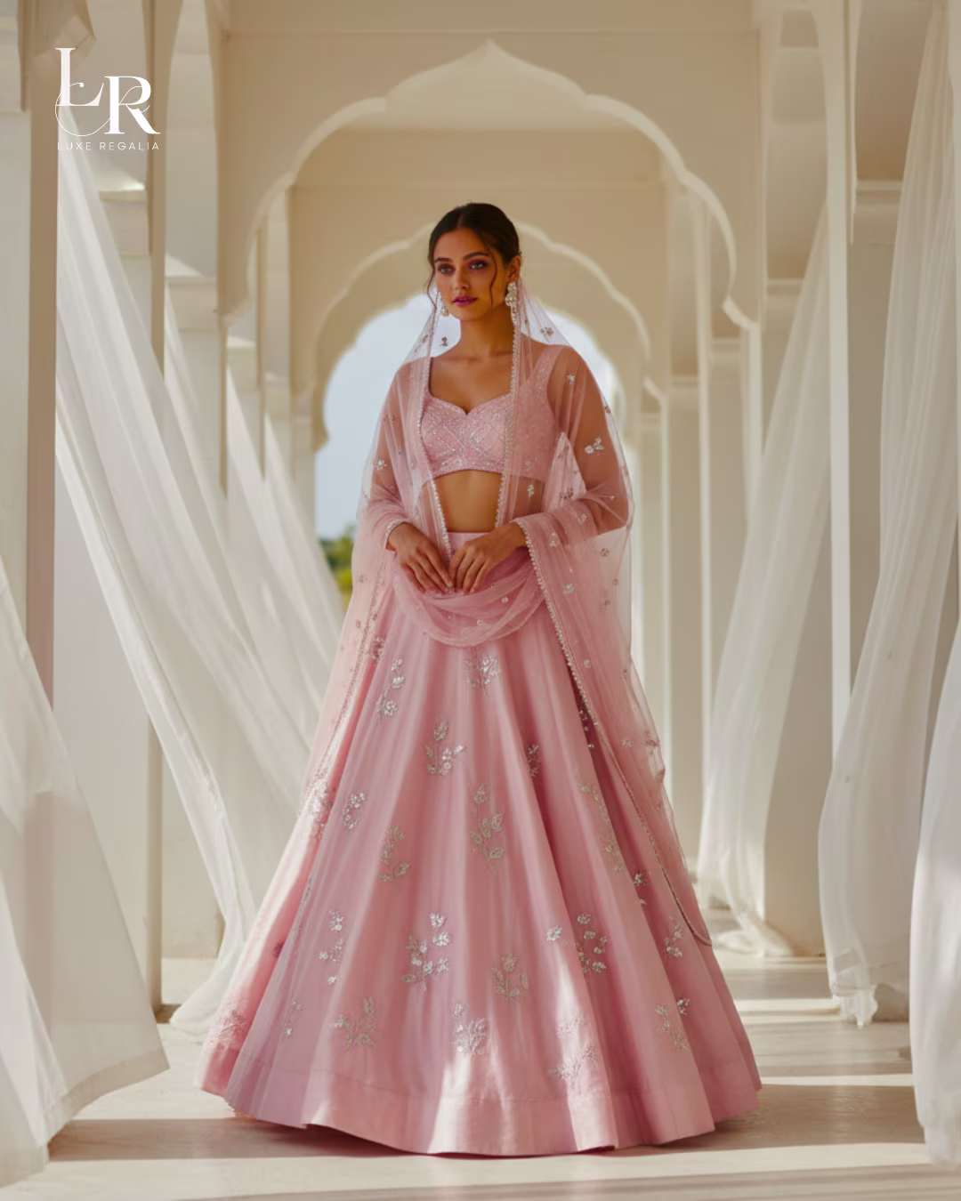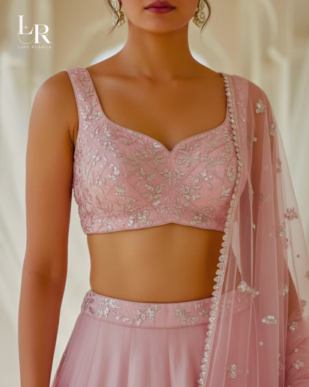 Blush Pink Sequin Embroidered Lehenga Choli: Make an ethereal statement at your next festive event with this blush pink lehenga set from Luxe Regalia. Crafted from premium net fabric, this ensemble features exquisite all-over sequin embroidery in delicate floral and vine motifs. The lehenga showcases a graceful, wide-flared silhouette for a royal appearance, while the matching blouse features a sweetheart neckline, intricate beadwork, and tailored shaping for a chic, contemporary fit. The ensemble is completed with a sheer, soft net dupatta adorned with scattered sequins and a finely detailed border, perfect for draping elegantly