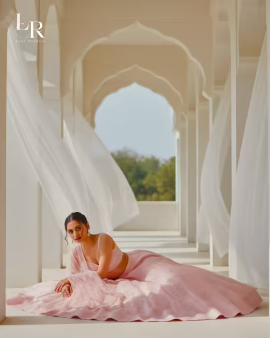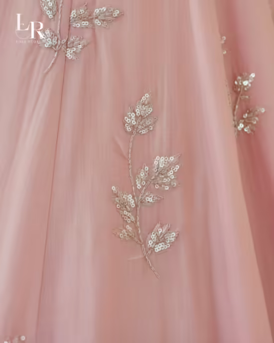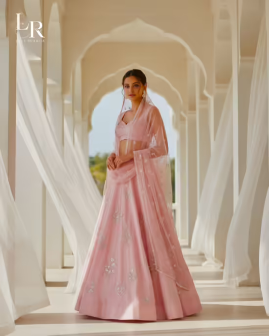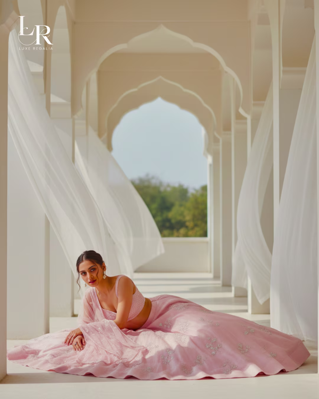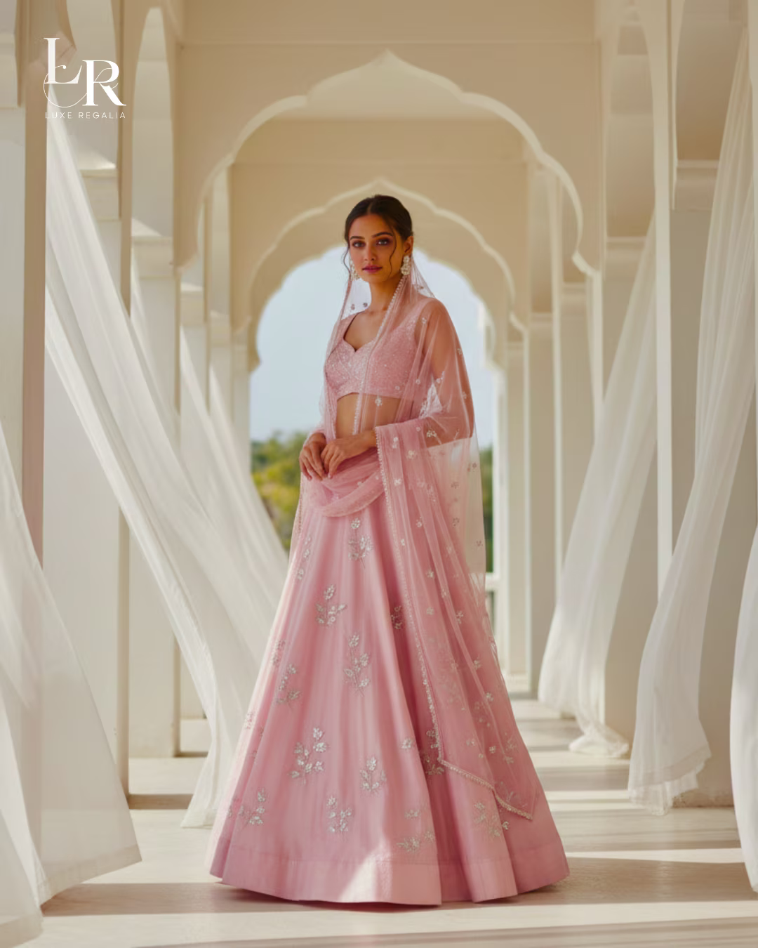 Blush Pink Sequin Embroidered Lehenga Choli: Make an ethereal statement at your next festive event with this blush pink lehenga set from Luxe Regalia. Crafted from premium net fabric, this ensemble features exquisite all-over sequin embroidery in delicate floral and vine motifs. The lehenga showcases a graceful, wide-flared silhouette for a royal appearance, while the matching blouse features a sweetheart neckline, intricate beadwork, and tailored shaping for a chic, contemporary fit. The ensemble is completed with a sheer, soft net dupatta adorned with scattered sequins and a finely detailed border, perfect for draping elegantly
