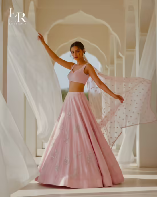 Lehenga Skirt: Wide flare (can-can for volume), embellished floral motifs, smooth waistband.