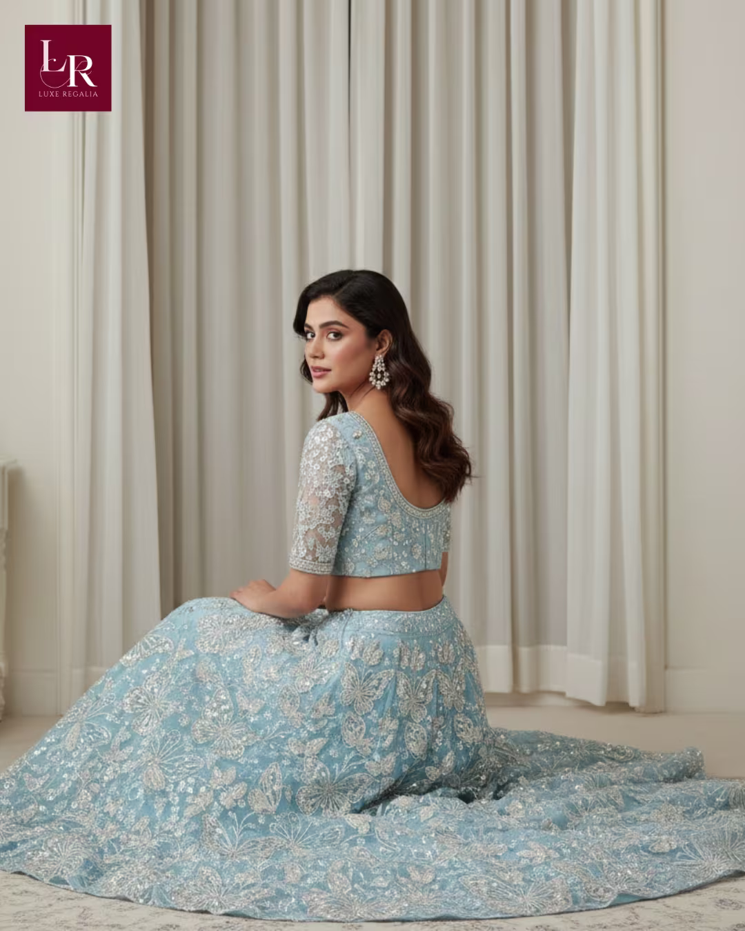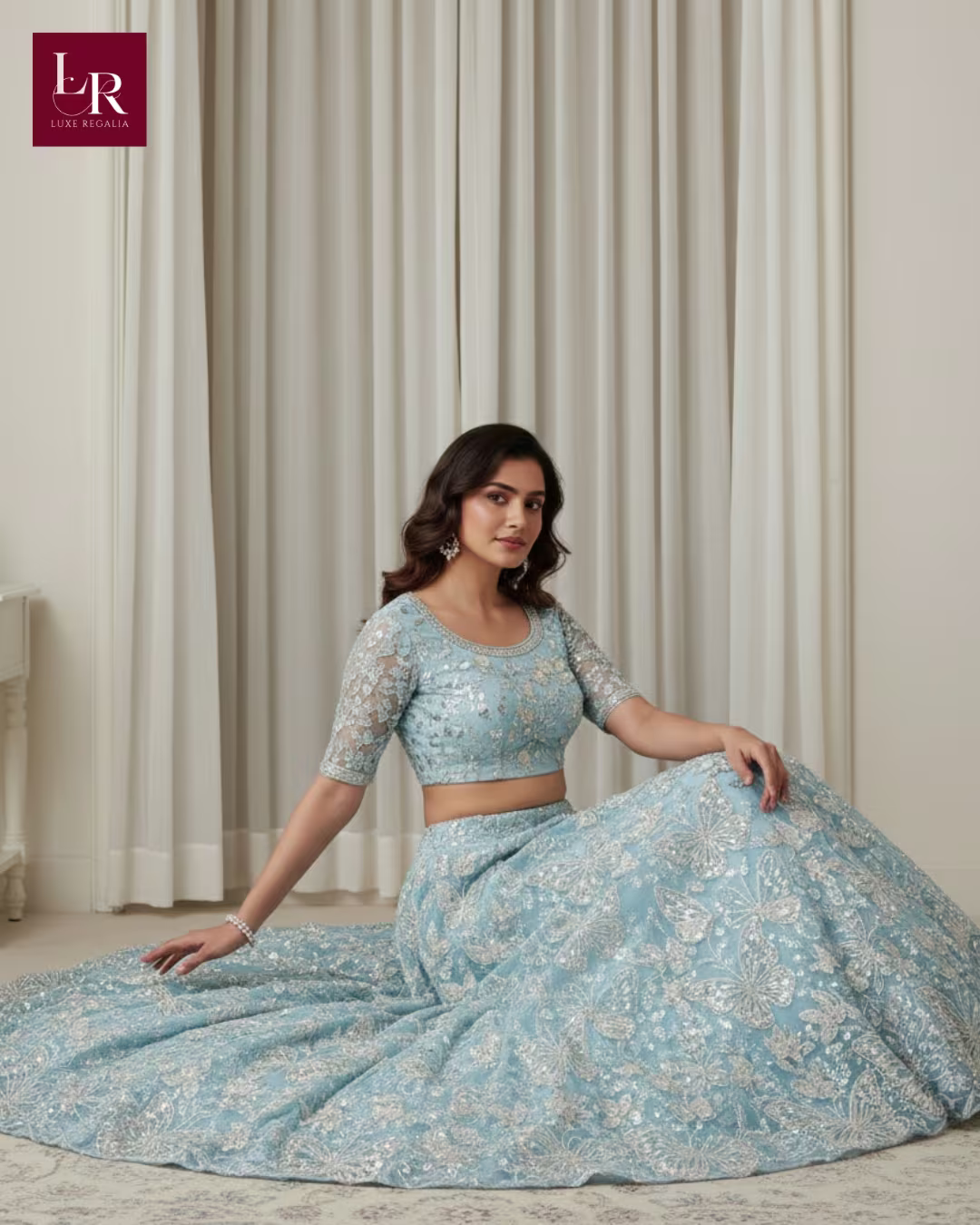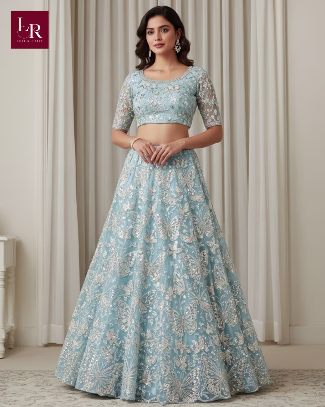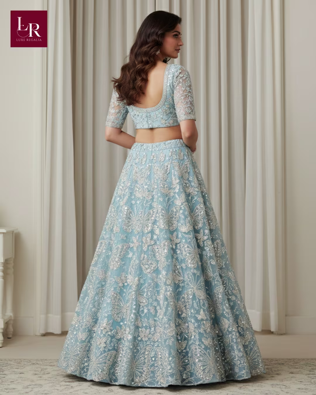 Icy Blue Butterfly Motif Sequin Embroidered Lehenga: Exude whimsical elegance in this contemporary icy blue lehenga set from Luxe Regalia. The lehenga skirt features an all-over motif of intricately hand-embroidered butterflies and delicate floral vines, brought to life with sparkling silver sequins, beads, and fine threadwork. The matching blouse is elegantly tailored with a scoop neckline, chic half sleeves in sheer embellished net, and a dramatic deep scoop back for a modern silhouette. The skirt’s voluminous flare emphasizes graceful movement and ensures the detailed butterfly motifs shimmer with every step. This elegant and minimal set creates an ethereal yet sophisticated presence ideal for luxury weddings and grand celebrations.