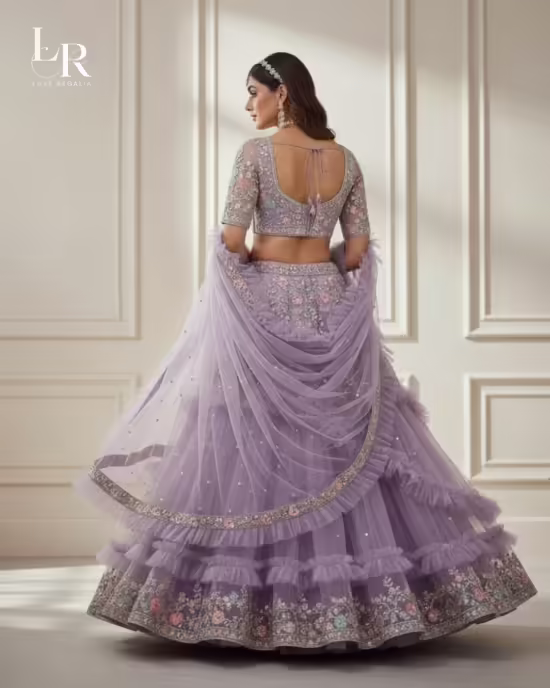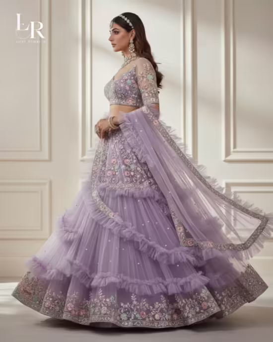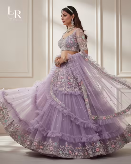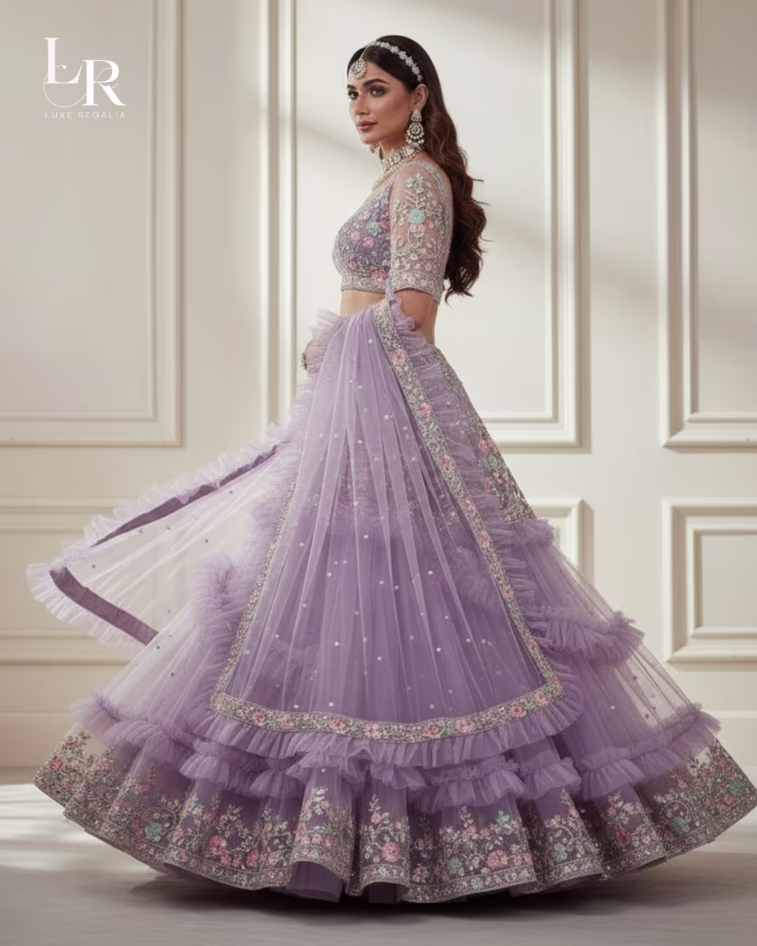Step into ethereal elegance with this Lavender Blossom Layered Ruffle Lehenga Choli, crafted for modern bridal and festive celebrations. The ensemble seamlessly combines whimsical layered ruffles with rich, traditional floral embroidery — embodying luxury, grace, and unmistakable charm.