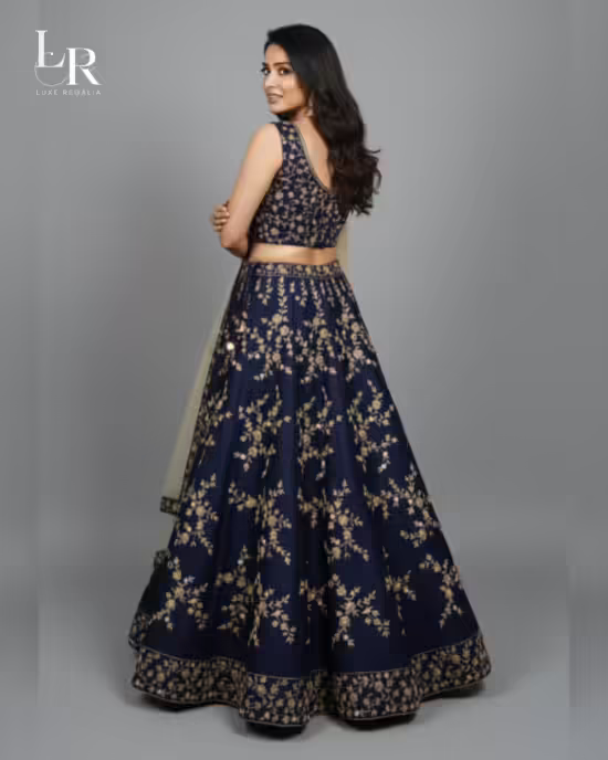 Navy Blue Silk Lehenga Choli with Golden Floral Embroidery