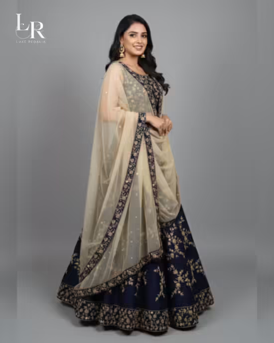 Navy Blue Silk Lehenga Choli with Golden Floral Embroidery: Make a sophisticated statement with our stunning navy blue lehenga choli. This exquisite ensemble is a perfect blend of traditional artistry and modern design, making it an ideal choice for weddings, receptions, and festive occasions. The deep navy blue silk is beautifully adorned with intricate golden floral embroidery that cascades down the lehenga, creating a look of timeless elegance. The contrasting beige dupatta adds a touch of contemporary grace, ensuring you look effortlessly chic.