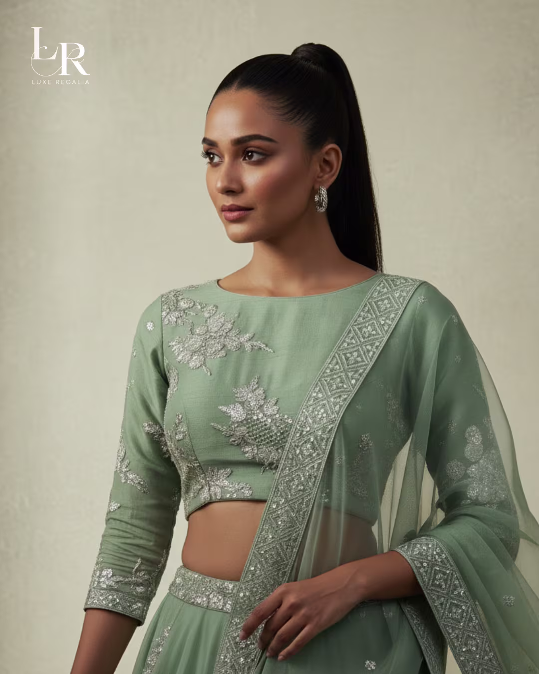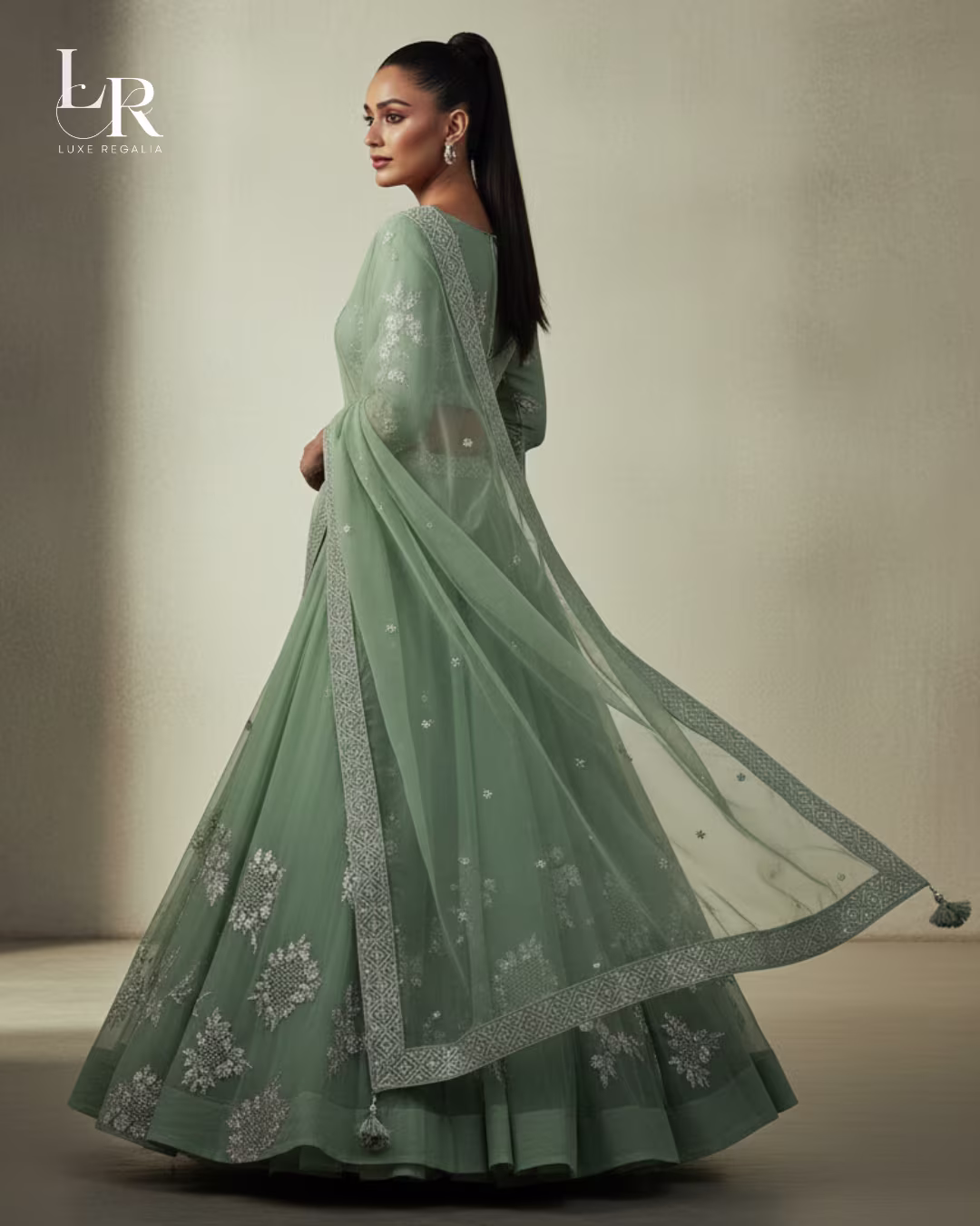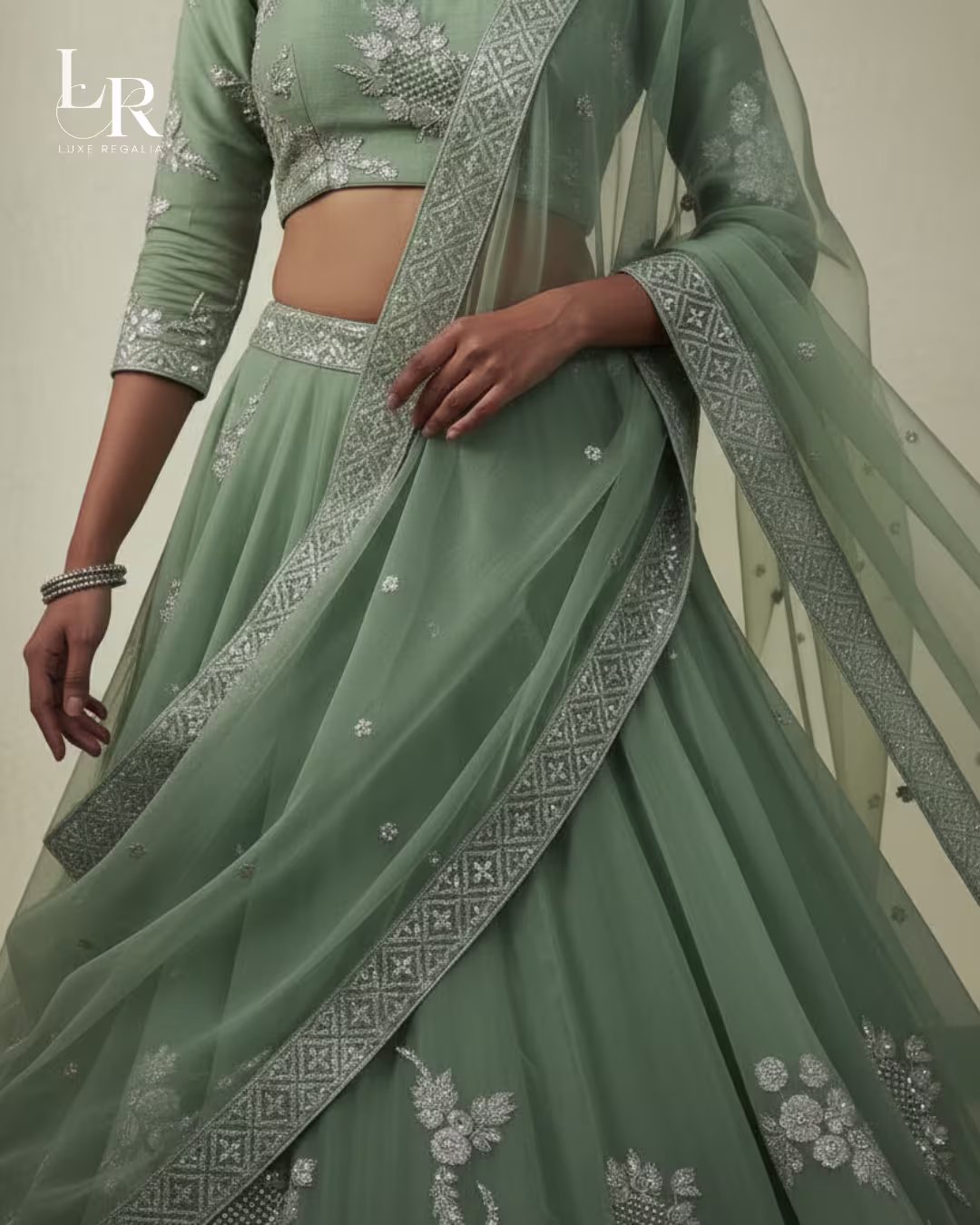 Sage Green Georgette Lehenga with Chikankari-Inspired Silver Embroidery: Immerse yourself in the elegance of Luxe Regalia’s sage green lehenga, crafted from lightweight, flowy georgette. The ensemble is adorned with fine chikankari-inspired embroidery, enhanced with subtle silver gota outlining to add a sophisticated shimmer. The blouse features a modest closed round neckline and graceful elbow-length sleeves, combining comfort with a refined silhouette. The sheer georgette dupatta is delicately bordered with silver shimmer lace for understated luxury and draped to highlight the ensemble’s serene, contemporary mood.