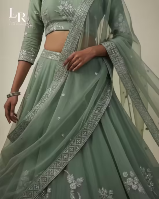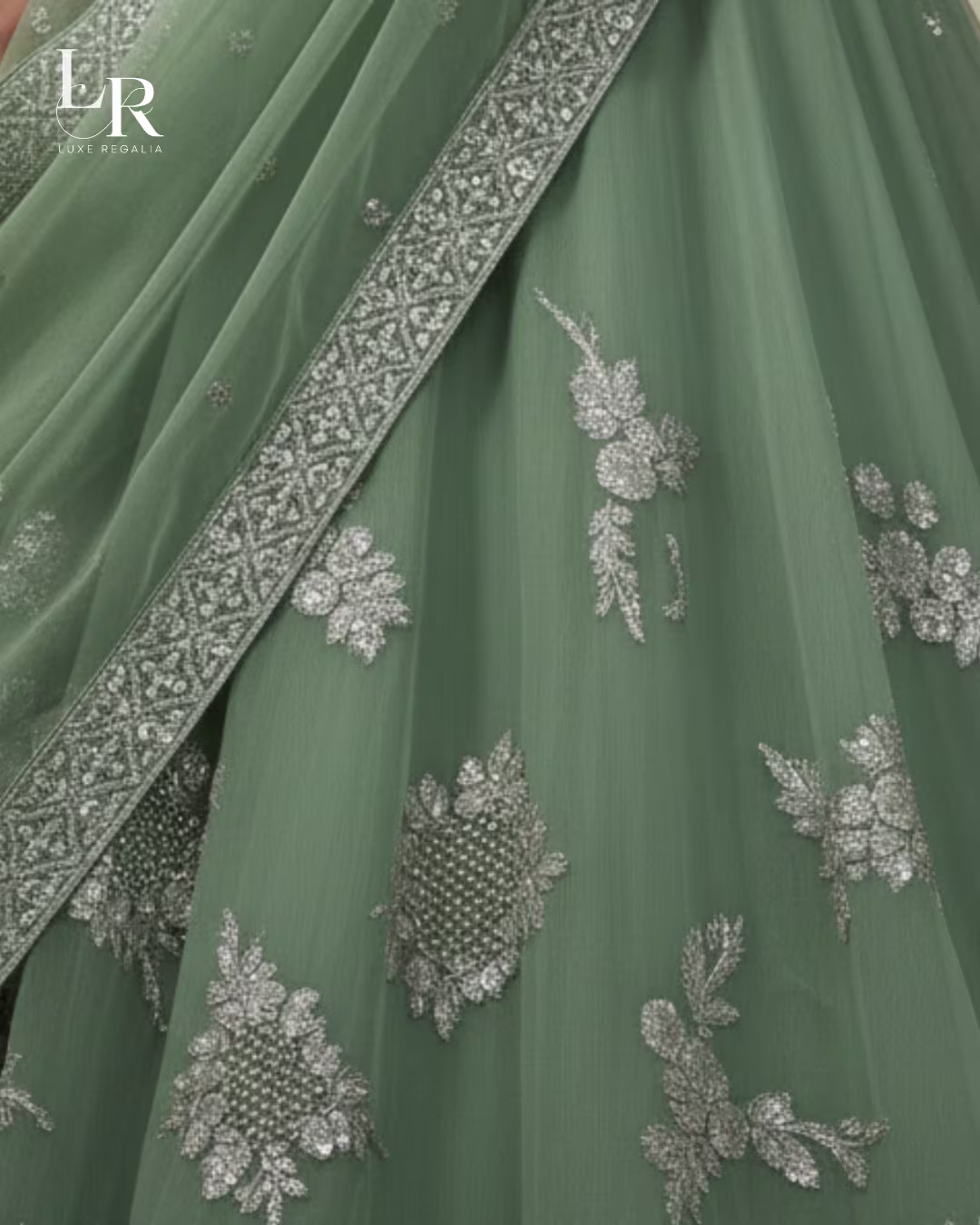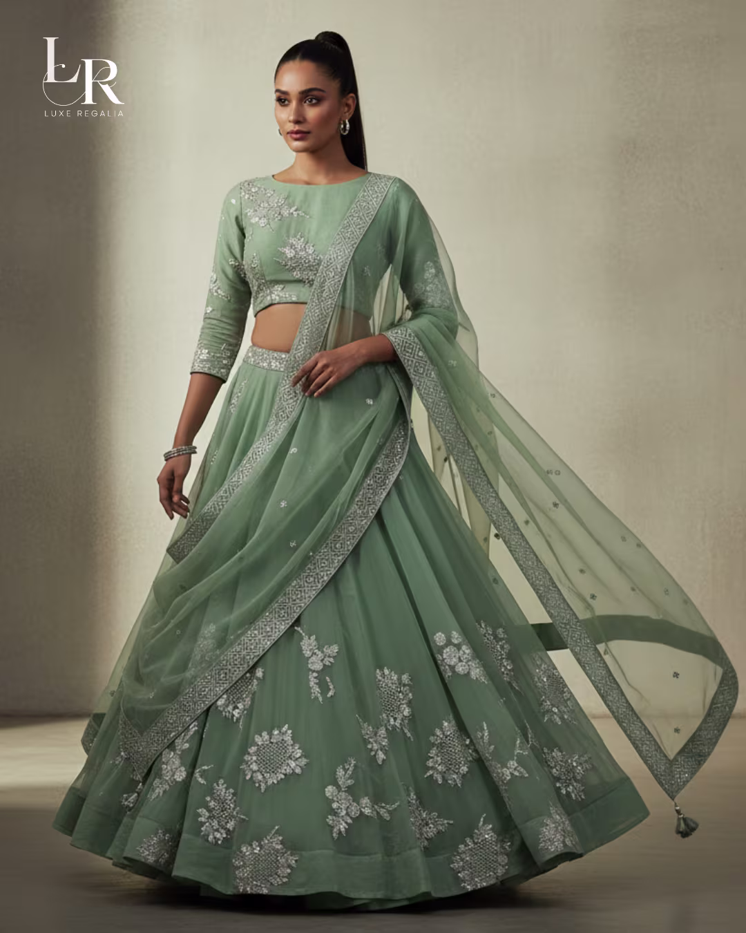 Sage Green Georgette Lehenga with Chikankari-Inspired Silver Embroidery: Immerse yourself in the elegance of Luxe Regalia’s sage green lehenga, crafted from lightweight, flowy georgette. The ensemble is adorned with fine chikankari-inspired embroidery, enhanced with subtle silver gota outlining to add a sophisticated shimmer. The blouse features a modest closed round neckline and graceful elbow-length sleeves, combining comfort with a refined silhouette. The sheer georgette dupatta is delicately bordered with silver shimmer lace for understated luxury and draped to highlight the ensemble’s serene, contemporary mood.